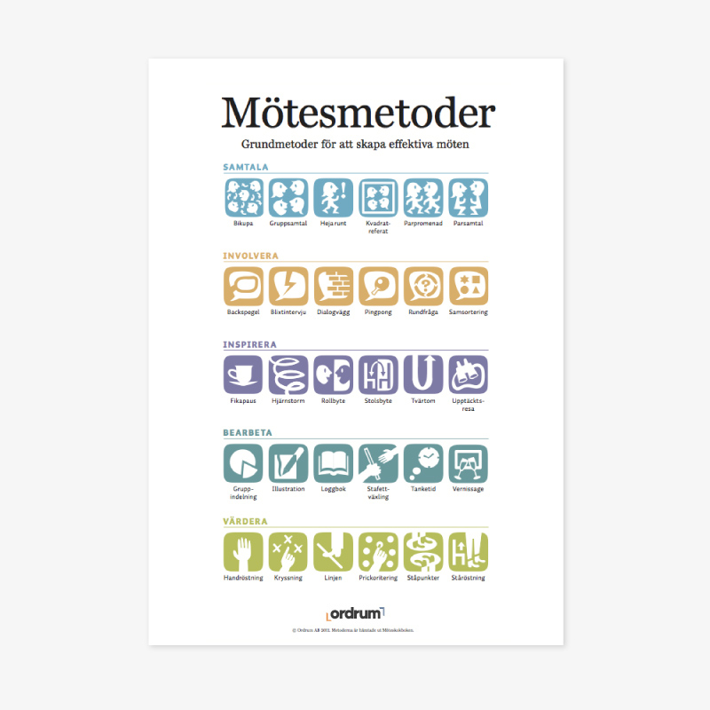 En affisch med de trettio grundmetoder för att skapa effektiva möten som presenteras i Möteskokboken.