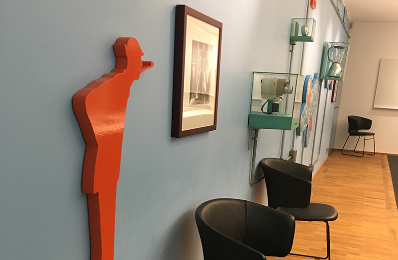 På väggen i konferensrummet sitter en installation skapad av Martin Wickström. Allt börjar med Jacques Tati. En noggrann man som inte lämnade något åt slumpen, sägs det, därför gick det också långt mellan filmerna. Det fick ta tid.