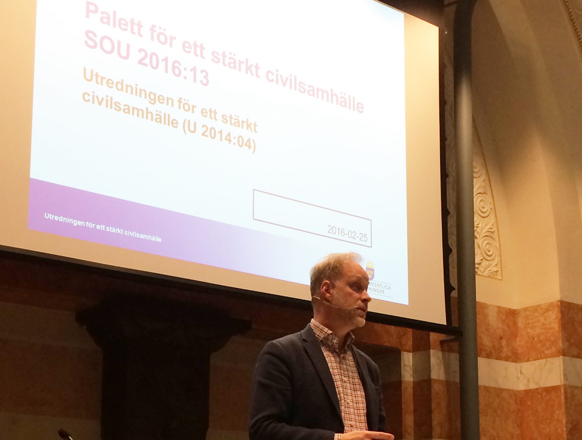 När betänkandet ”Palett för ett stärkt civilsamhälle” presenterades på Rosenbad ledde Erik Mattsson samtalet. På scenen fanns utredaren Dan Ericson, men också representanter från tre inbjudna organisationer som fick ge sina synpunkter på betänkandet.