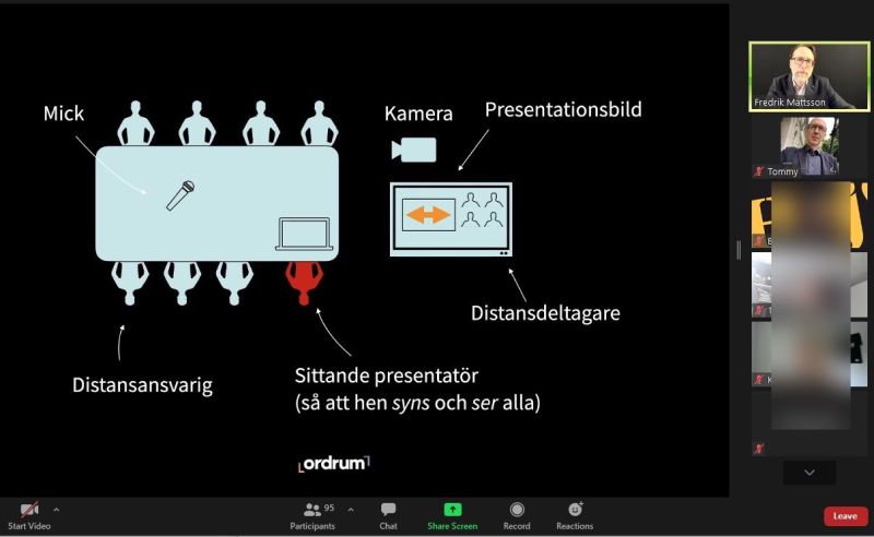 I samarbete med Svenska möten har Ordrum givit två kortwebbinarium: Att leda hybridmöten och Att presentera digitalt. Stor uppslutning och stort engagemang, vilket glädjer oss! Hybridmöten är här för att stanna men hur får man till dessa på bästa sätt? Det ställer höga krav på mötesledaren. Läs mer om vår föreläsning kring hybridmöten under rubriken Möten – Föreläsningar. Bilden är från Fredrik Mattssons smakprovspresentation om hybridmöten. 100 digitala deltagare från myndigheter, kommuner, organisationer och större och mindre företag fanns på plats framför sina datorer.