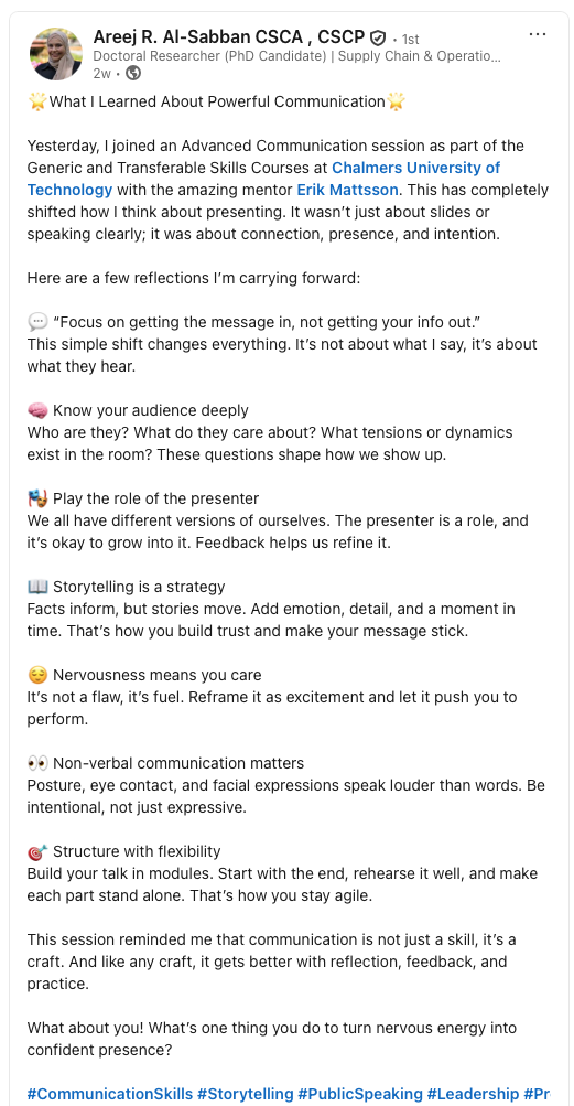 Igår deltog jag i kursen ”Advancerad Communication” som en del av kursen ”Generic and Transferable Skills” vid Chalmers tekniska högskola med den fantastiska mentorn Erik Mattsson. Detta har helt förändrat mitt sätt att tänka på presentationer. Det handlade inte bara om bilder eller att tala tydligt, utan om kontakt, närvaro och intention.