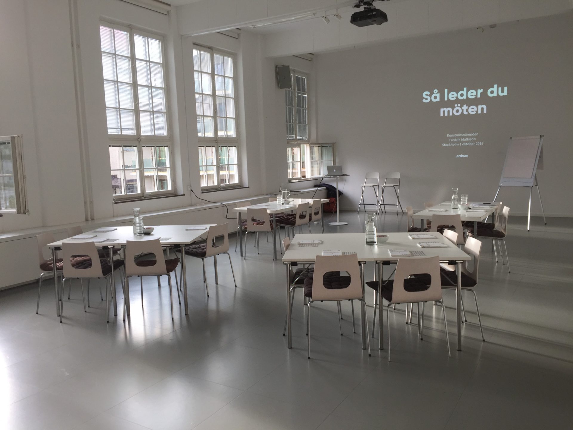 På uppdrag av Kunskapsgruppen höll Ordrums Fredrik Mattsson en heldagsutbildning för den statliga myndigheten Konstnärsnämndens personal. Temat var konsten att leda möten och gruppen fick arbeta praktiskt kring hur man skapar möten som svarar mot förväntningar och syfte. Självklart använde vi vår egen Möteskokboken som praktiskt studiematerial. En viktig faktor för att få möten att fungera väl är ändamålsenliga lokaler. Och det hade vi verkligen hos Konstnärsnämnden på söder i Stockholm.