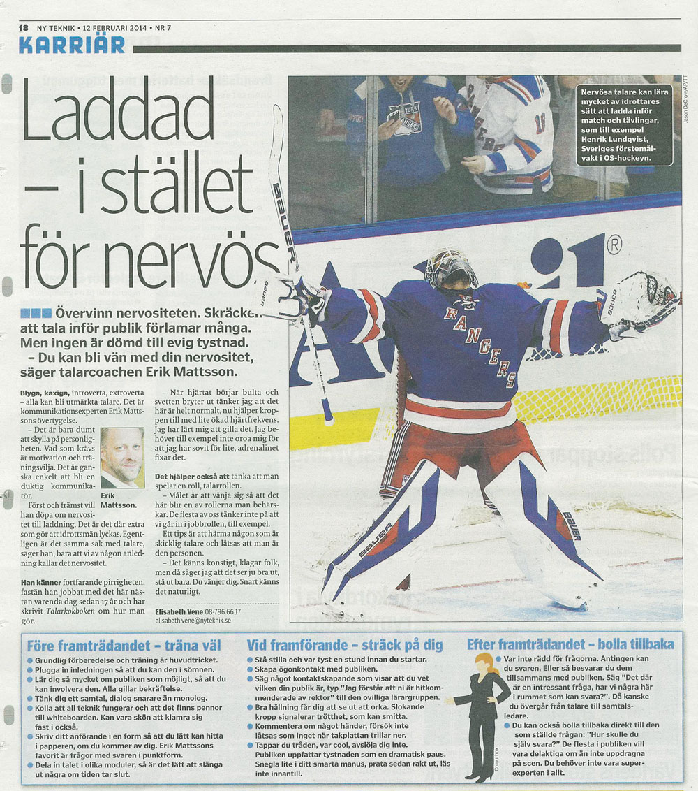 En artikel om Talarkokboken finns i tidningen ”Ny Teknik” den 12 februari: ”Ingen är dömd till evig tystnad – Du kan bli vän med din nervositet, säger talarcoachen Erik Mattsson”.